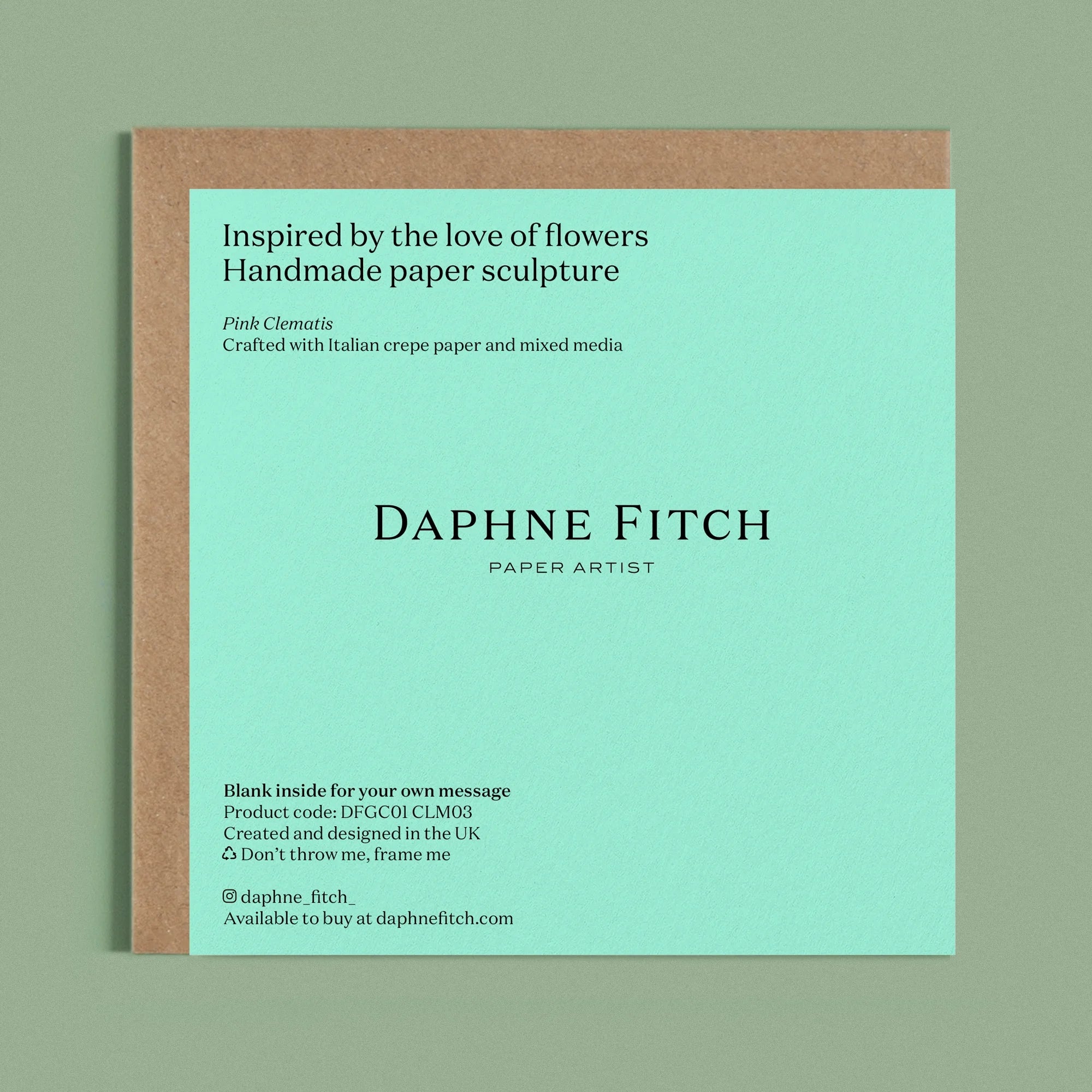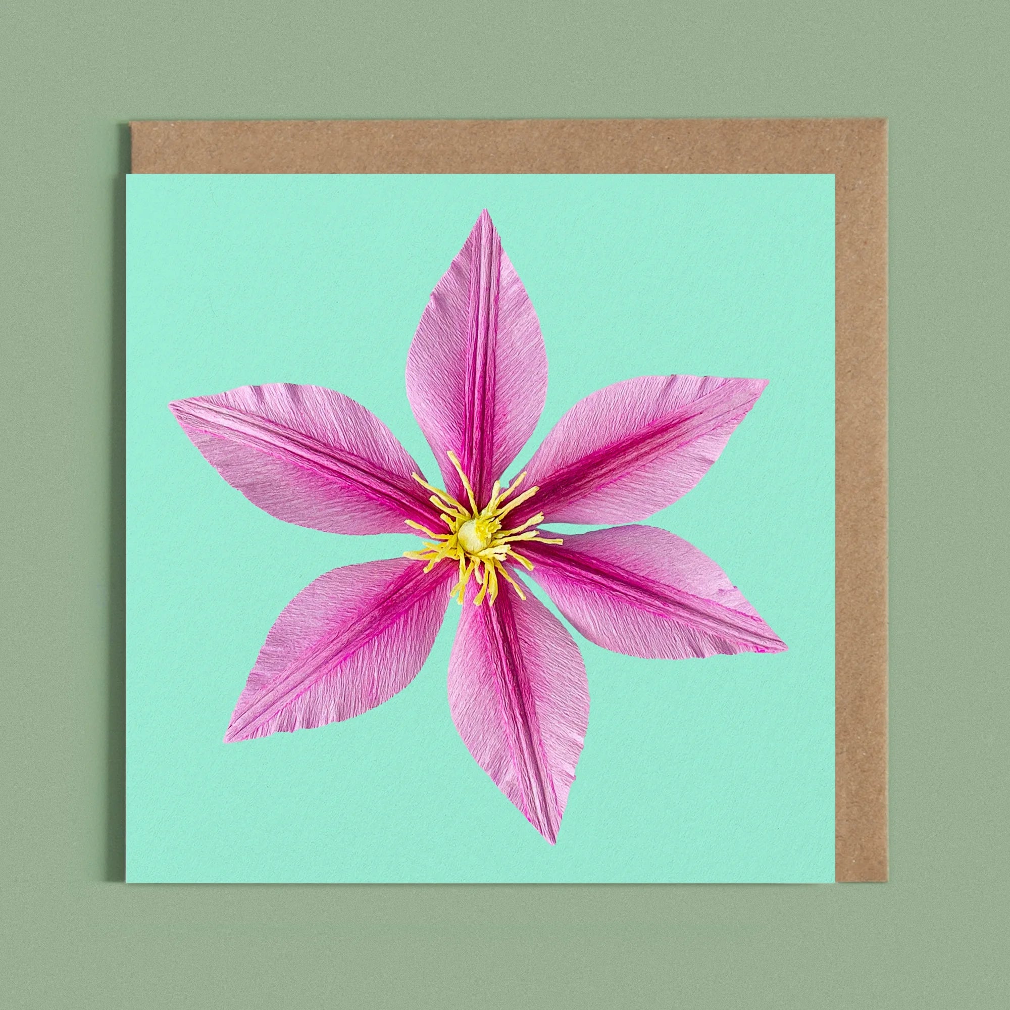 This blank greetings card features an image of handcrafted paper pink clematis on a bright green background. The paper clematis is crafted from Italian crepe paper and mixed media. Created, designed and printed in the UK.