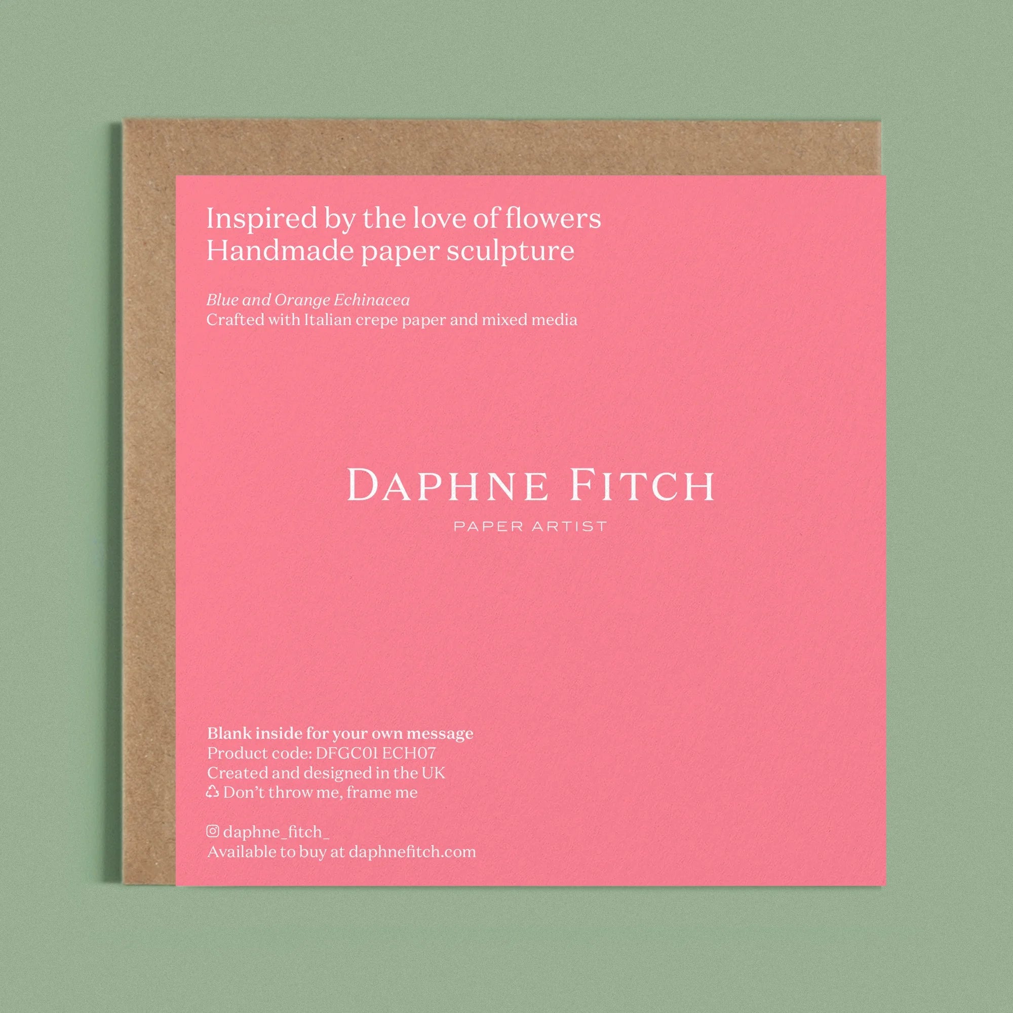 This blank greetings card features an image of a handcrafted paper blue and orange echinacea on pink background. The paper echinacea is crafted from Italian crepe paper and mixed media. Created, designed and printed in the UK.