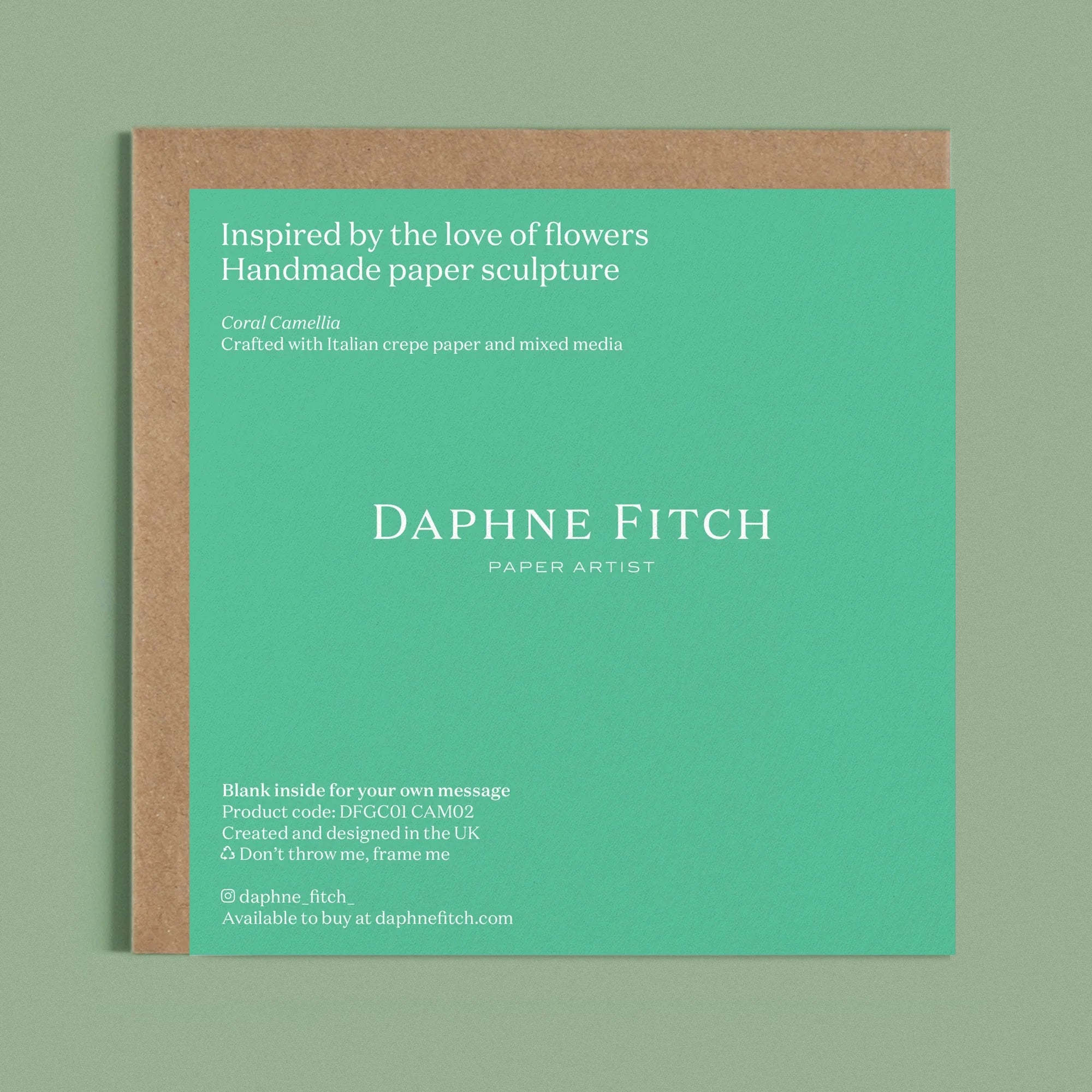 This blank greetings card features an image of handcrafted paper coral camellia on a bright green background. The paper foliage is crafted from Italian crepe paper and mixed media. Created, designed and printed in the UK.