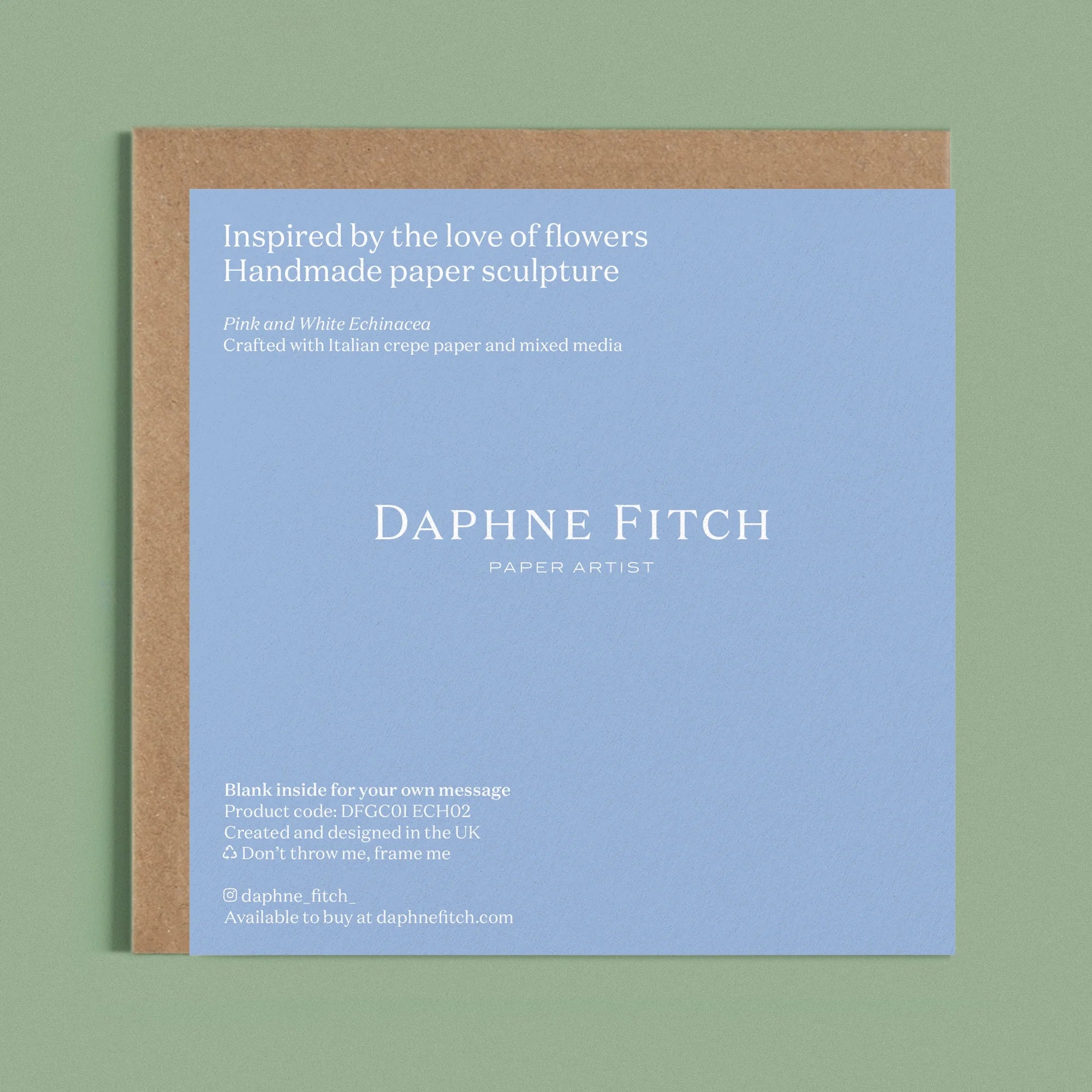 This blank greetings card features an image of a handcrafted paper pink and white echinacea on a light blue background. The paper echinacea is crafted from Italian crepe paper and mixed media. Created, designed and printed in the UK.