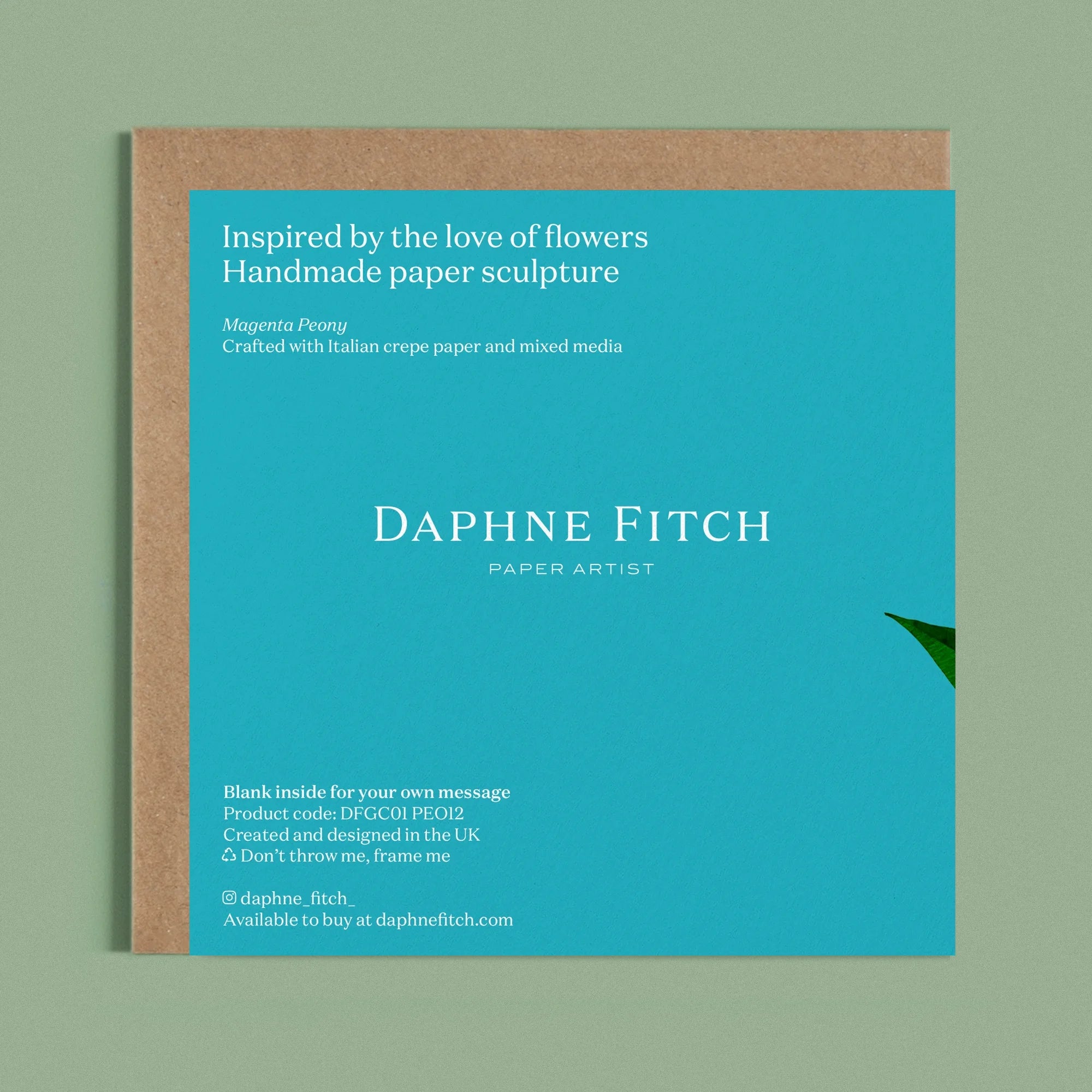 This blank greetings card features an image of handcrafted paper magenta peony on a blue background. The paper peony is crafted from Italian crepe paper and mixed media. Created, designed and printed in the UK.