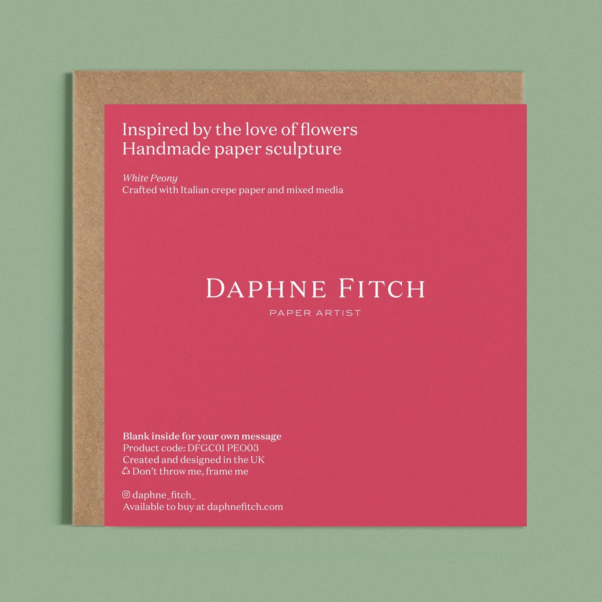 This blank greetings card features an image of a handcrafted paper white peony on a madder red background. The paper peony is crafted from Italian crepe paper and mixed media. Created, designed and printed in the UK.