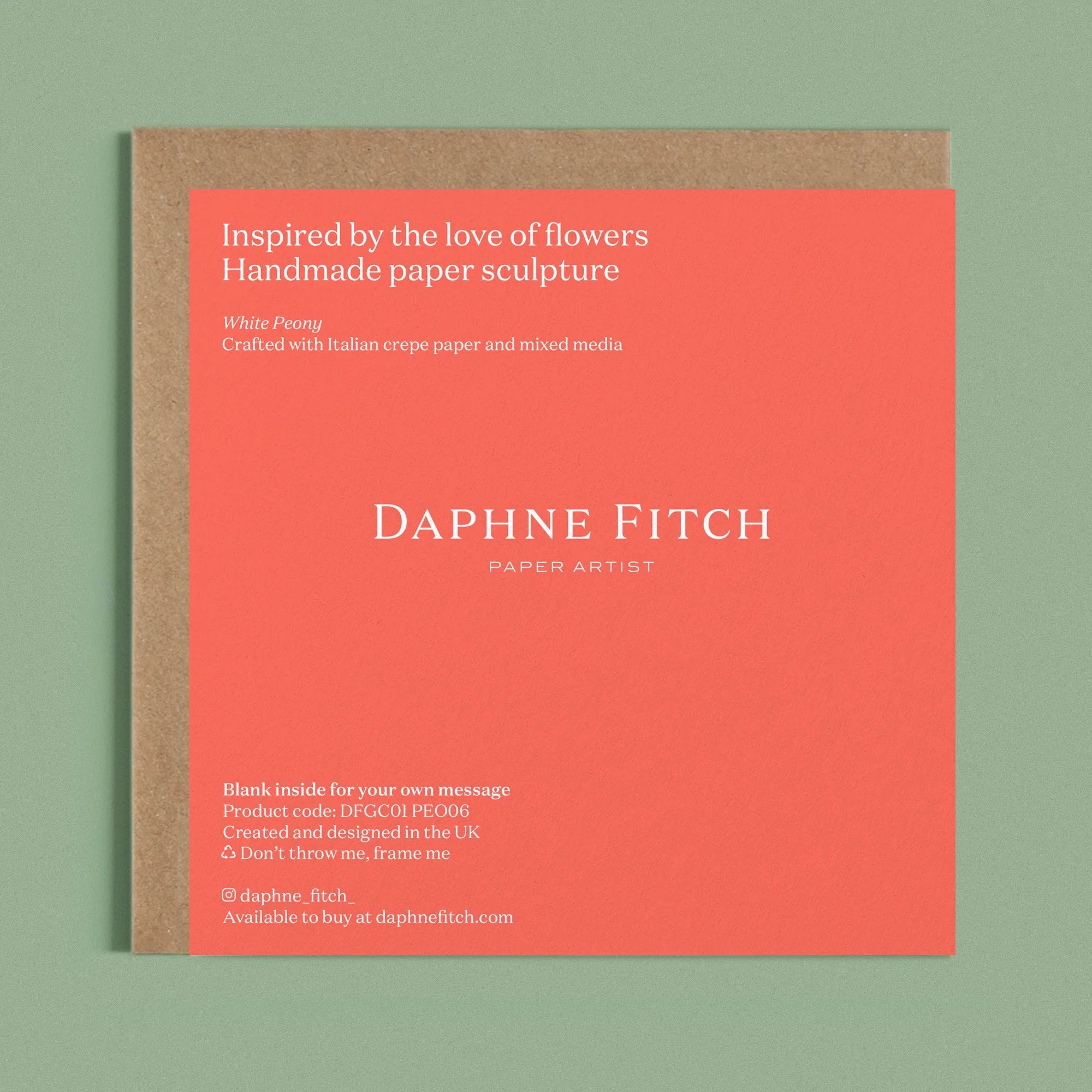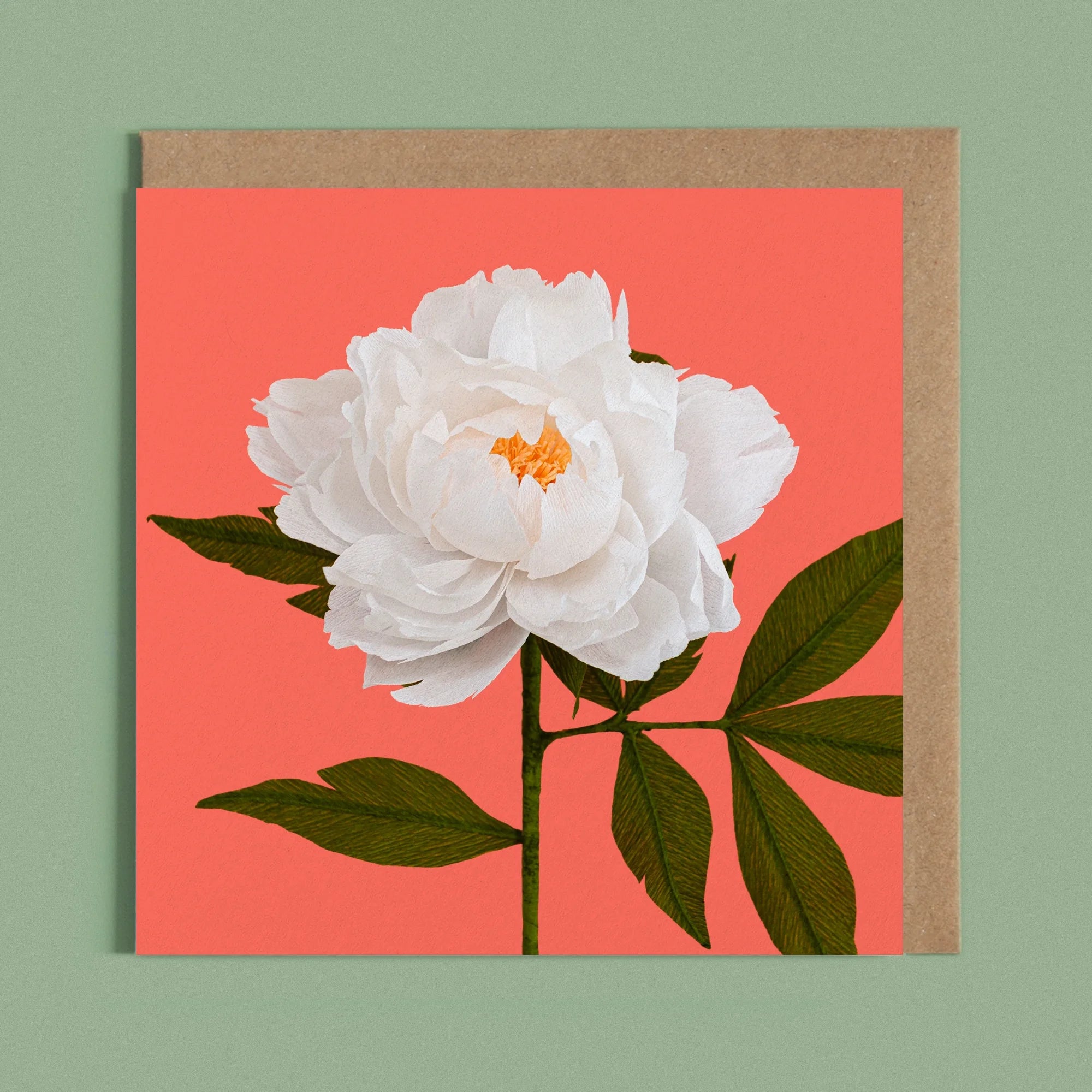 This blank greetings card features an image of handcrafted paper peony on a coral background. The paper peony is crafted from Italian crepe paper and mixed media. Created, designed and printed in the UK.