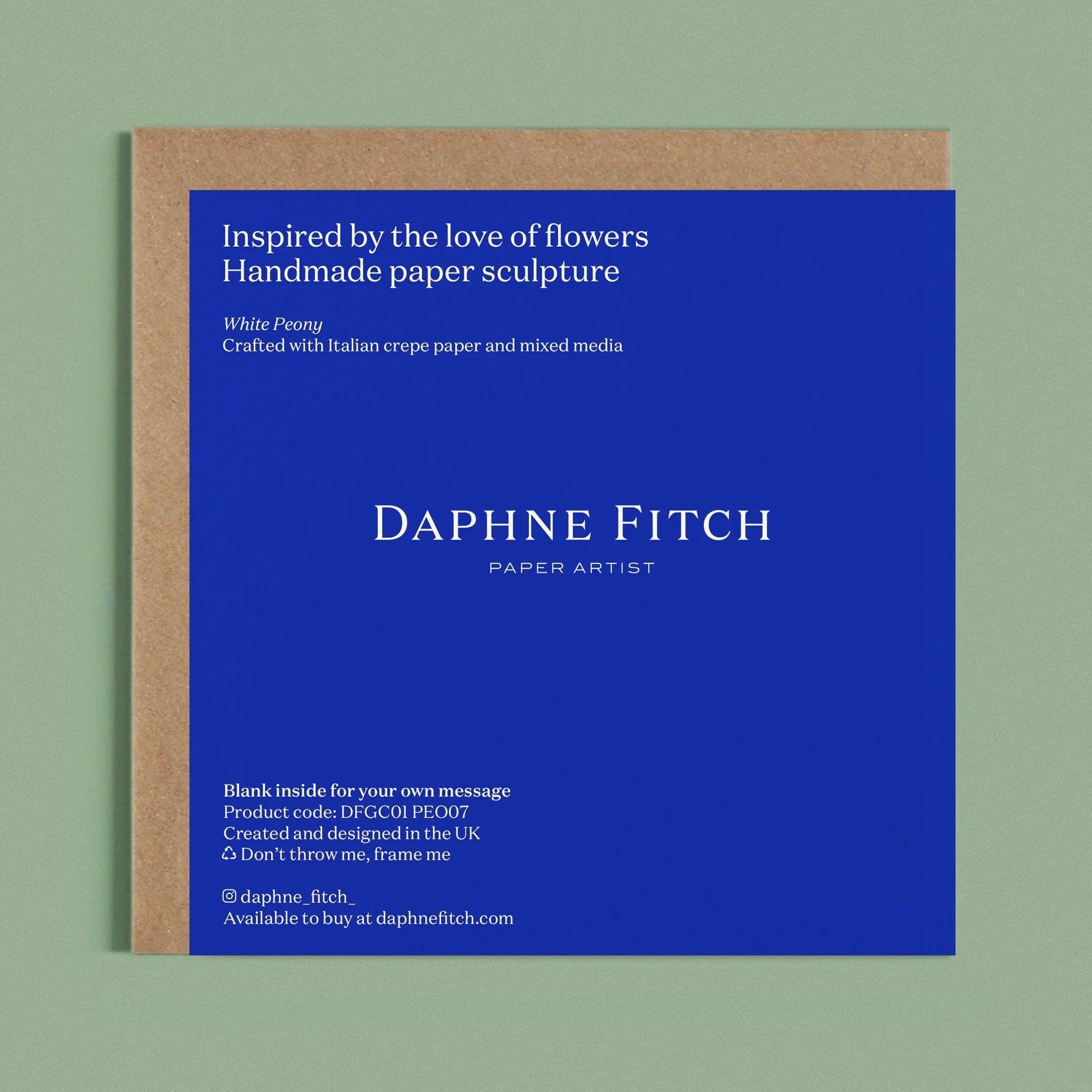 This blank greetings card features an image of handcrafted paper peony on a blue background. The paper peony is crafted from Italian crepe paper and mixed media. Created, designed and printed in the UK.