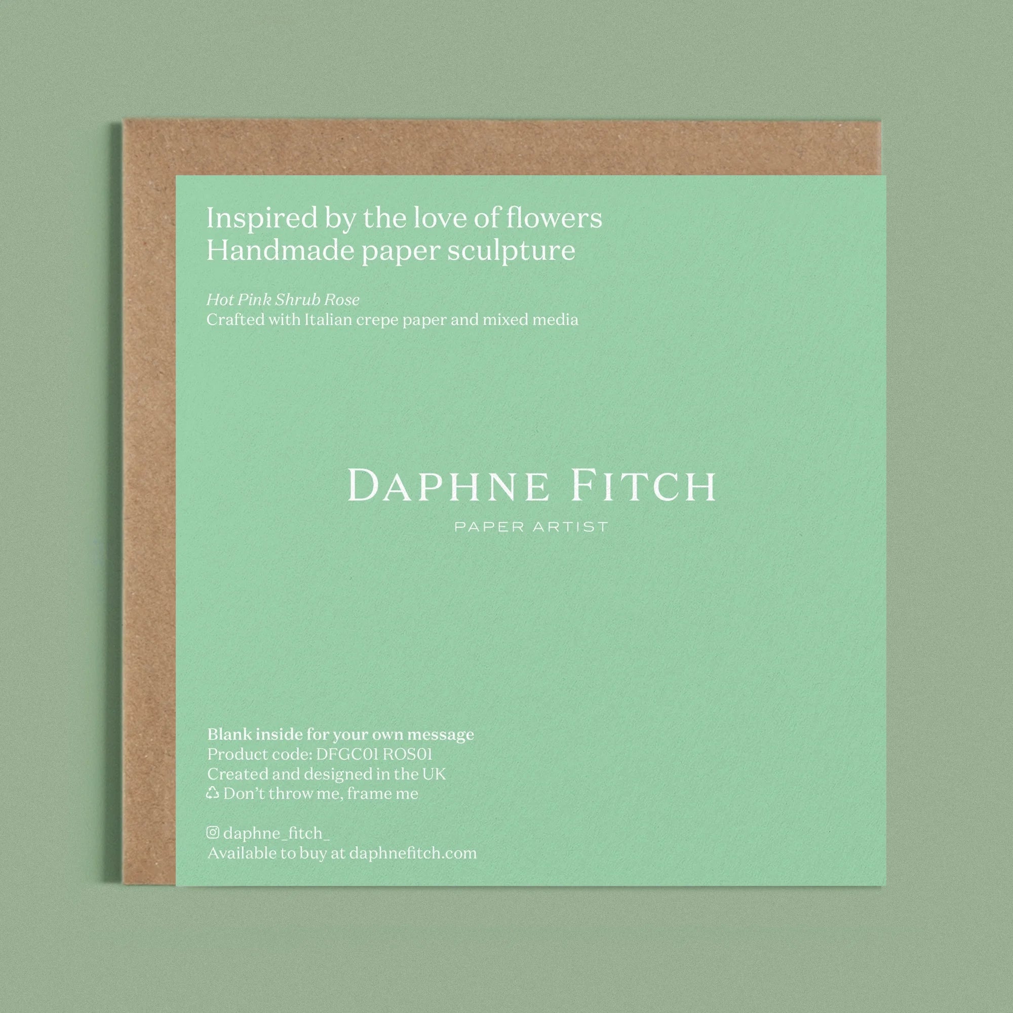 This blank greetings card features an image of a handcrafted paper hot pink rose on a Paris green background. The paper rose is crafted from Italian crepe paper and mixed media. Created, designed and printed in the UK.
