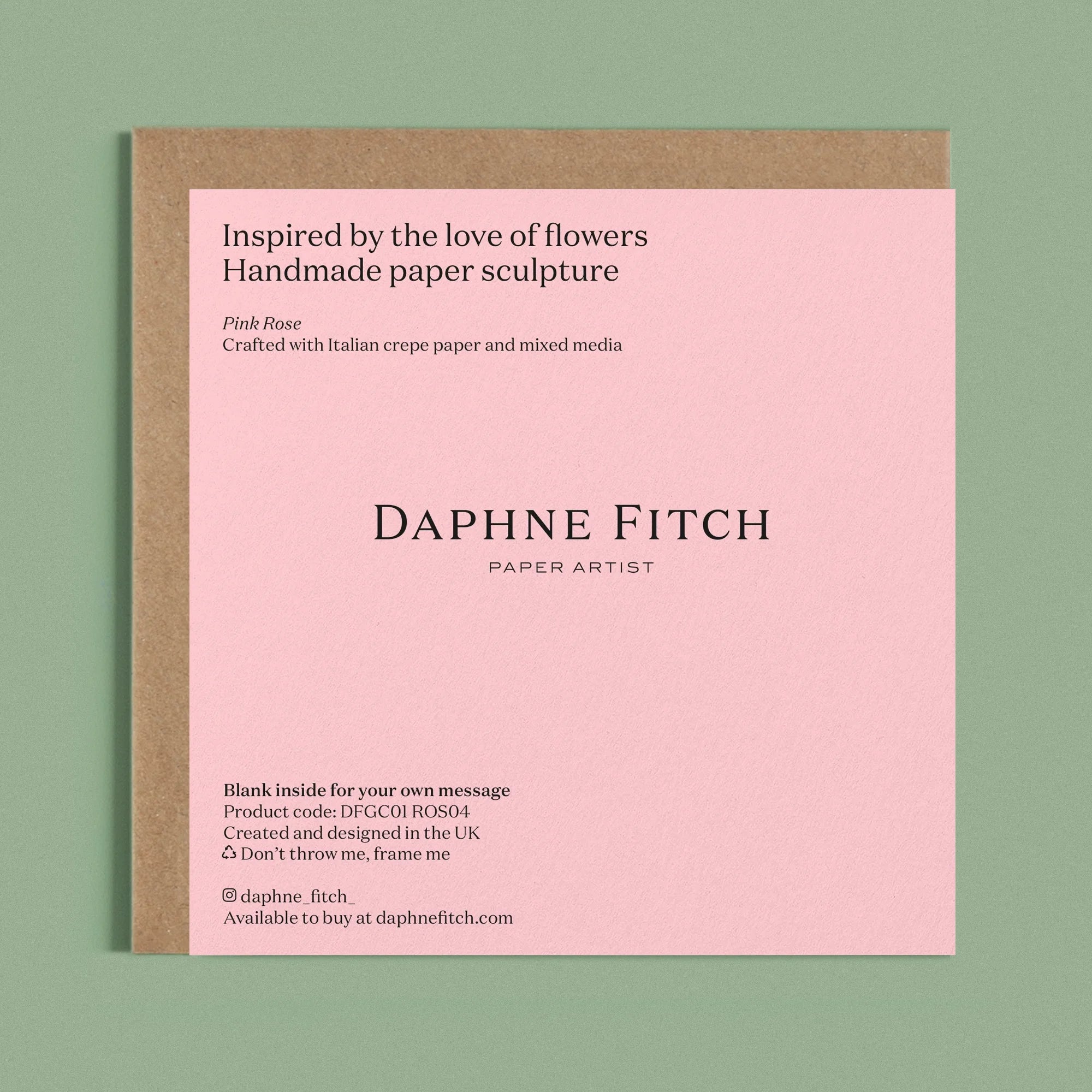This blank greetings card features an image of handcrafted paper rose on a soft pink background. The paper rose is crafted from Italian crepe paper and mixed media. Created, designed and printed in the UK.