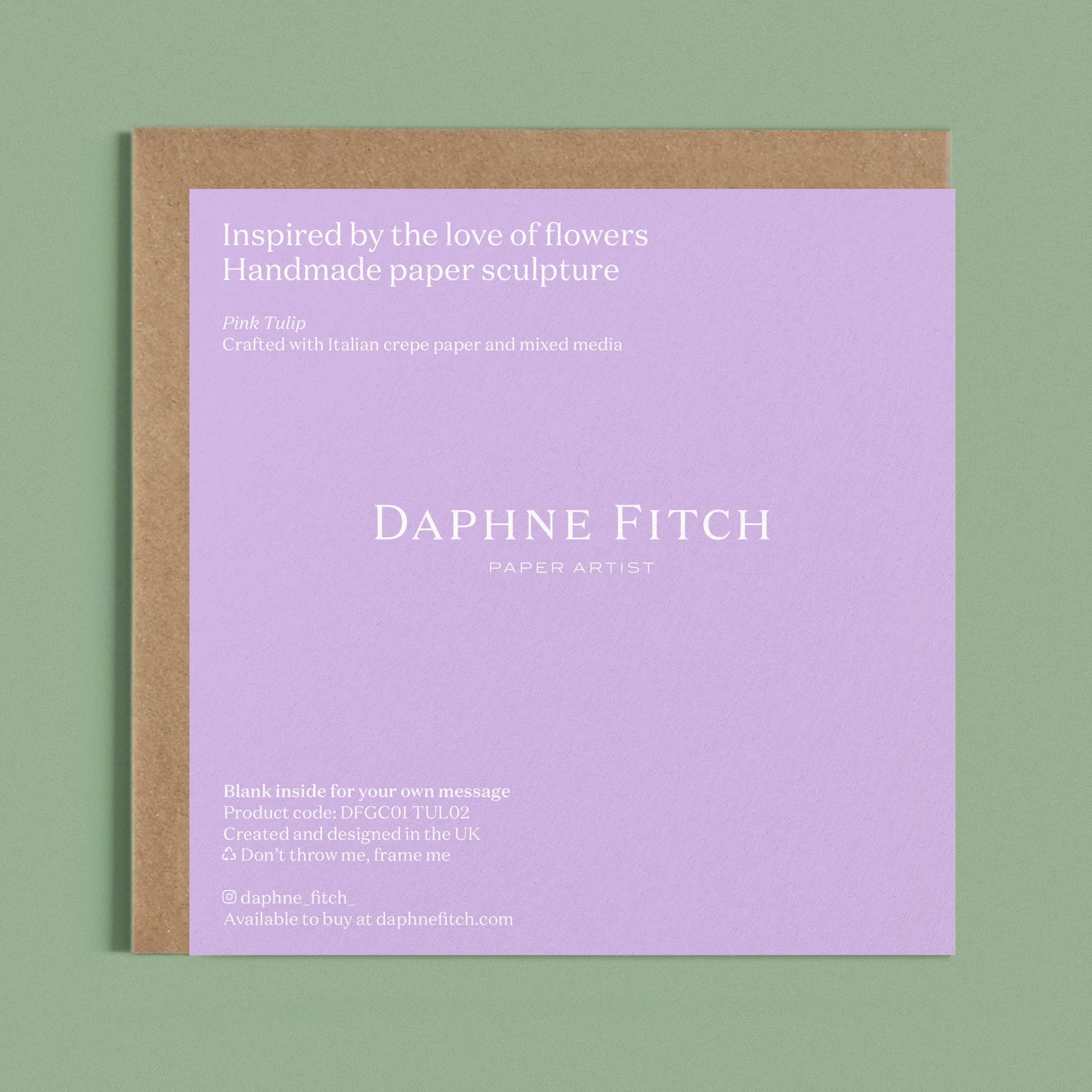 This blank greetings card features an image of handcrafted paper magenta tulip on a lilac background. The paper tulip is crafted from Italian crepe paper and mixed media. Created, designed and printed in the UK.