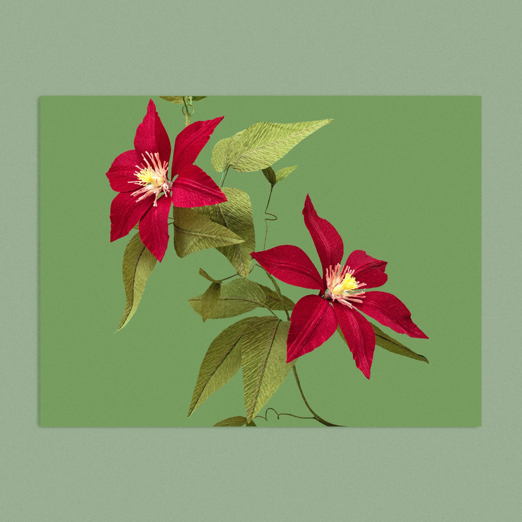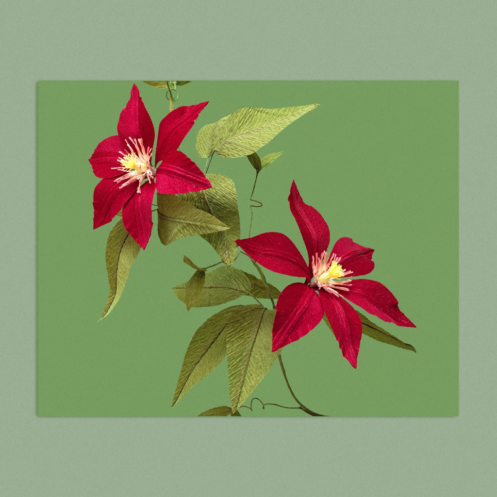 This unframed art print features an image of a handcrafted paper garnet red clematis made from Italian crepe paper and mixed media on a antique emerald green background. Printed on the highest quality Hahnemühle paper.