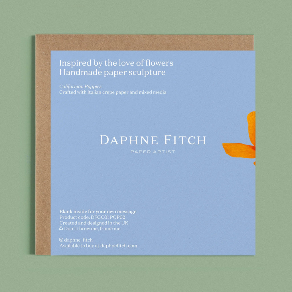 This greetings card features an image of a handcrafted paper fiery orange Californian poppies on a light cerulean blue background. The paper Californian poppies are crafted from Italian crepe paper and mixed media. Created, designed and printed in the UK.